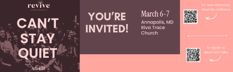 Valley Baptist Church will be taking a group of women to the BCM/D Revive Women's Conference on March 6-7, 2026. The group discount price is $45 and can be paid online at the time of registration (by February 15th) or through cash or check brought to Valley by Sunday, February 15th. Visit